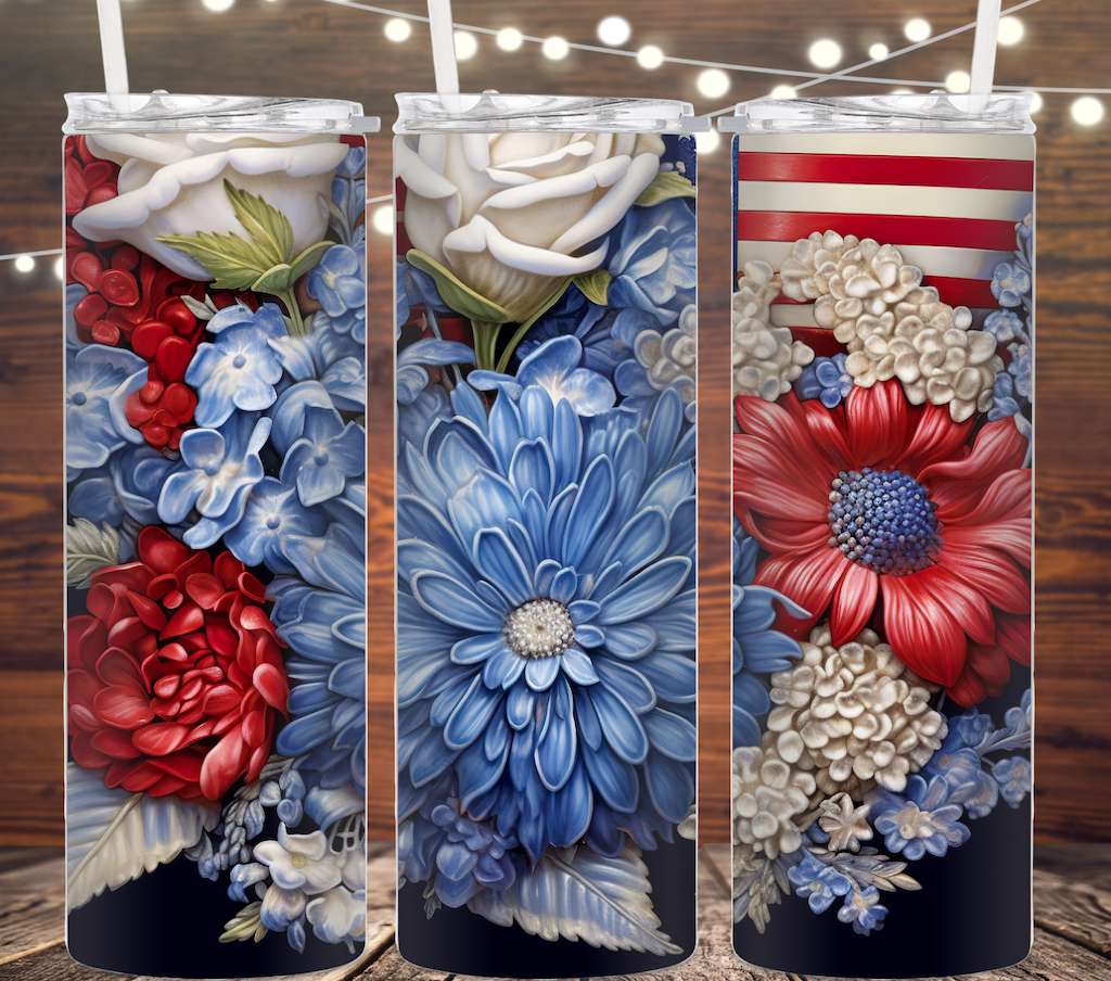 Here we have pretty tumbler with beautiful red, white and blue flowers on it with an American Flag.