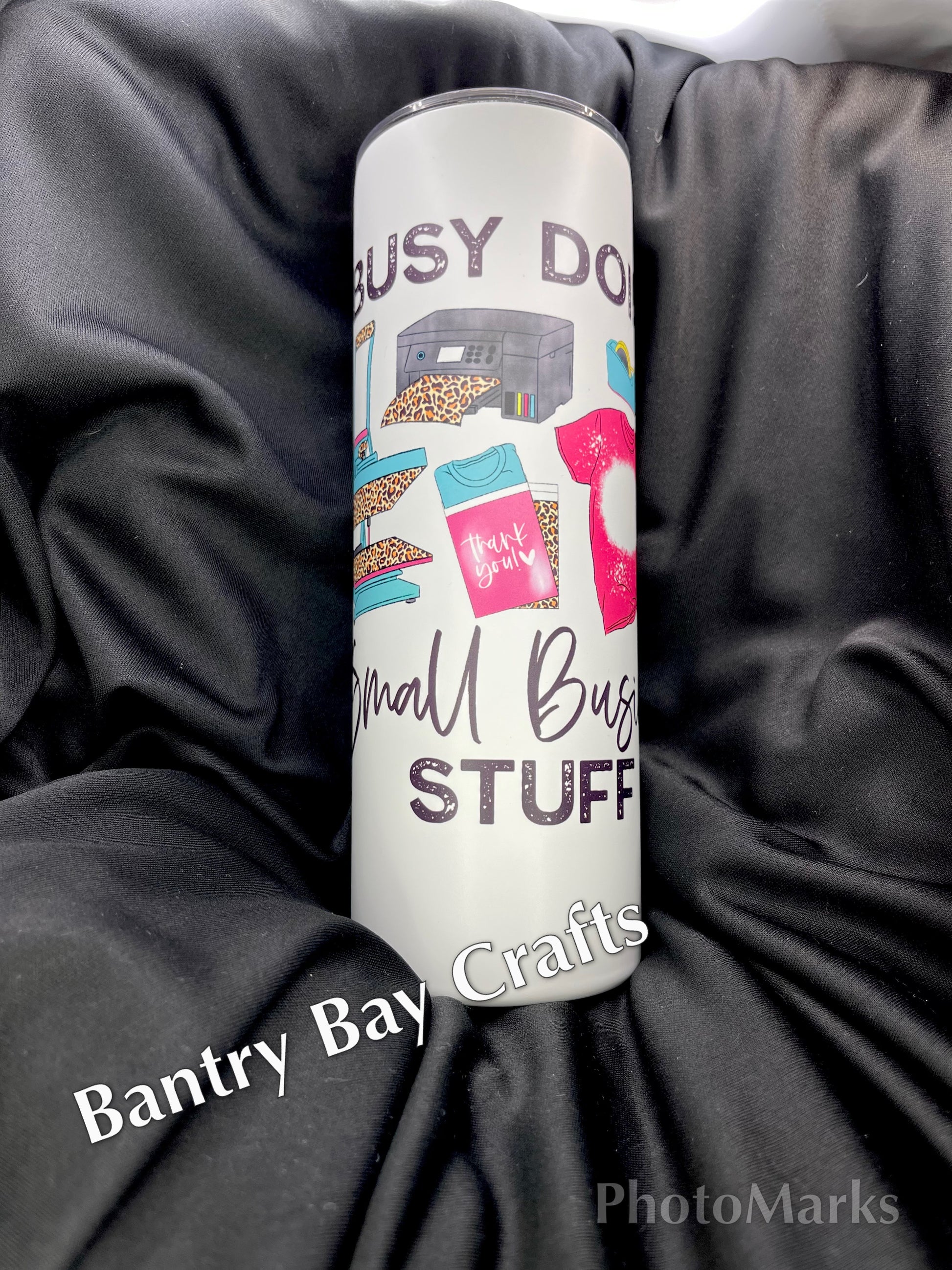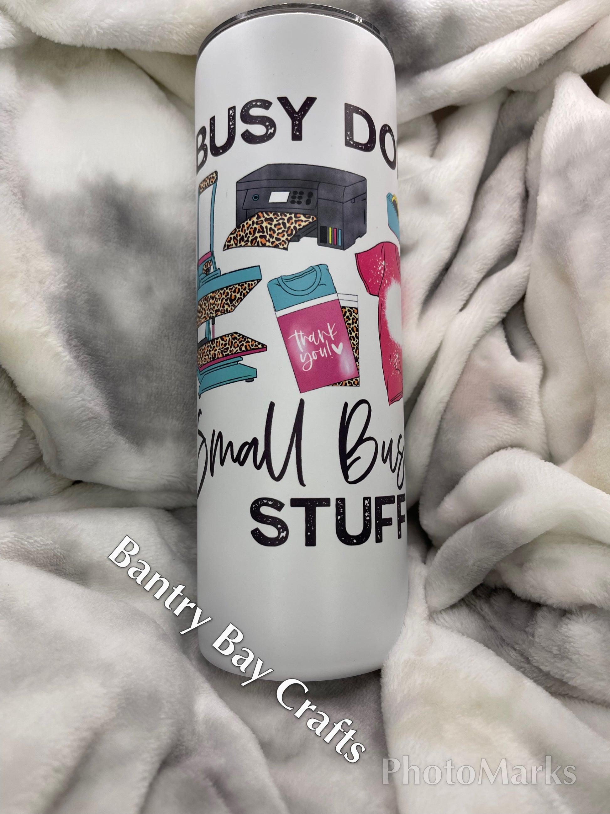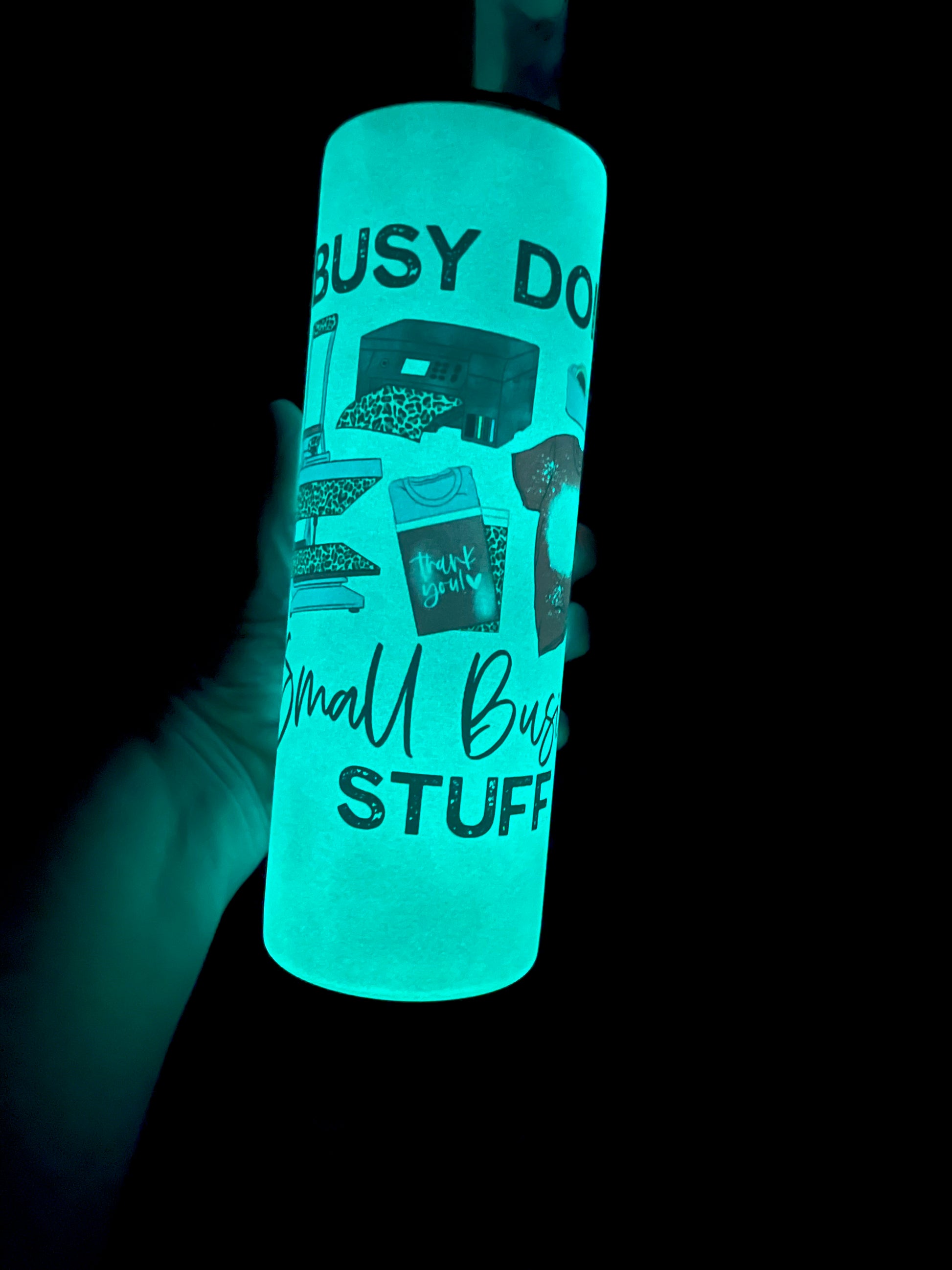 Here we have a double insulated stainless steel that says We have a busy doing small business stuff that glows in the dark . This particular theme is based off crafting . We can do this tumbler in glossy as well .