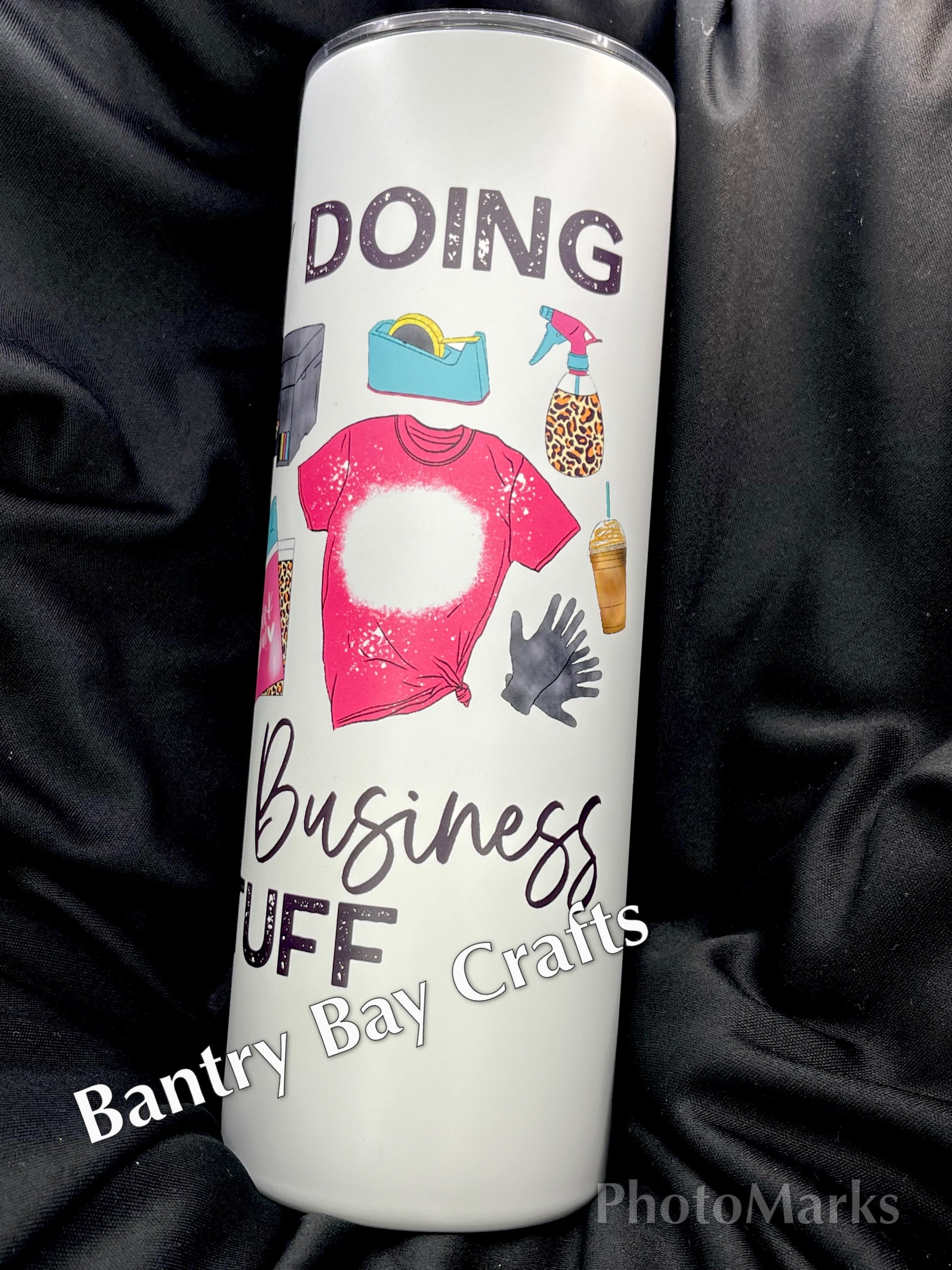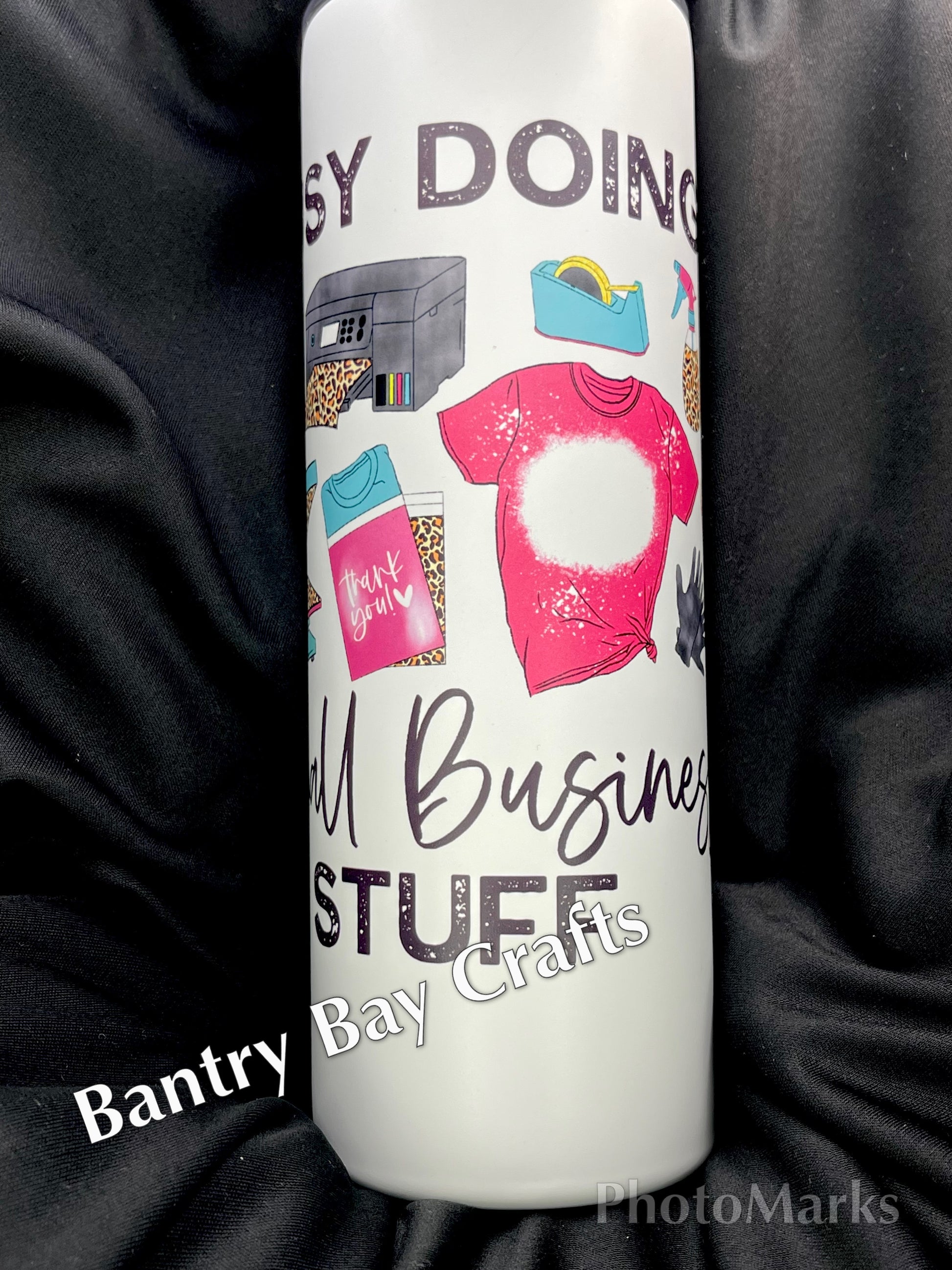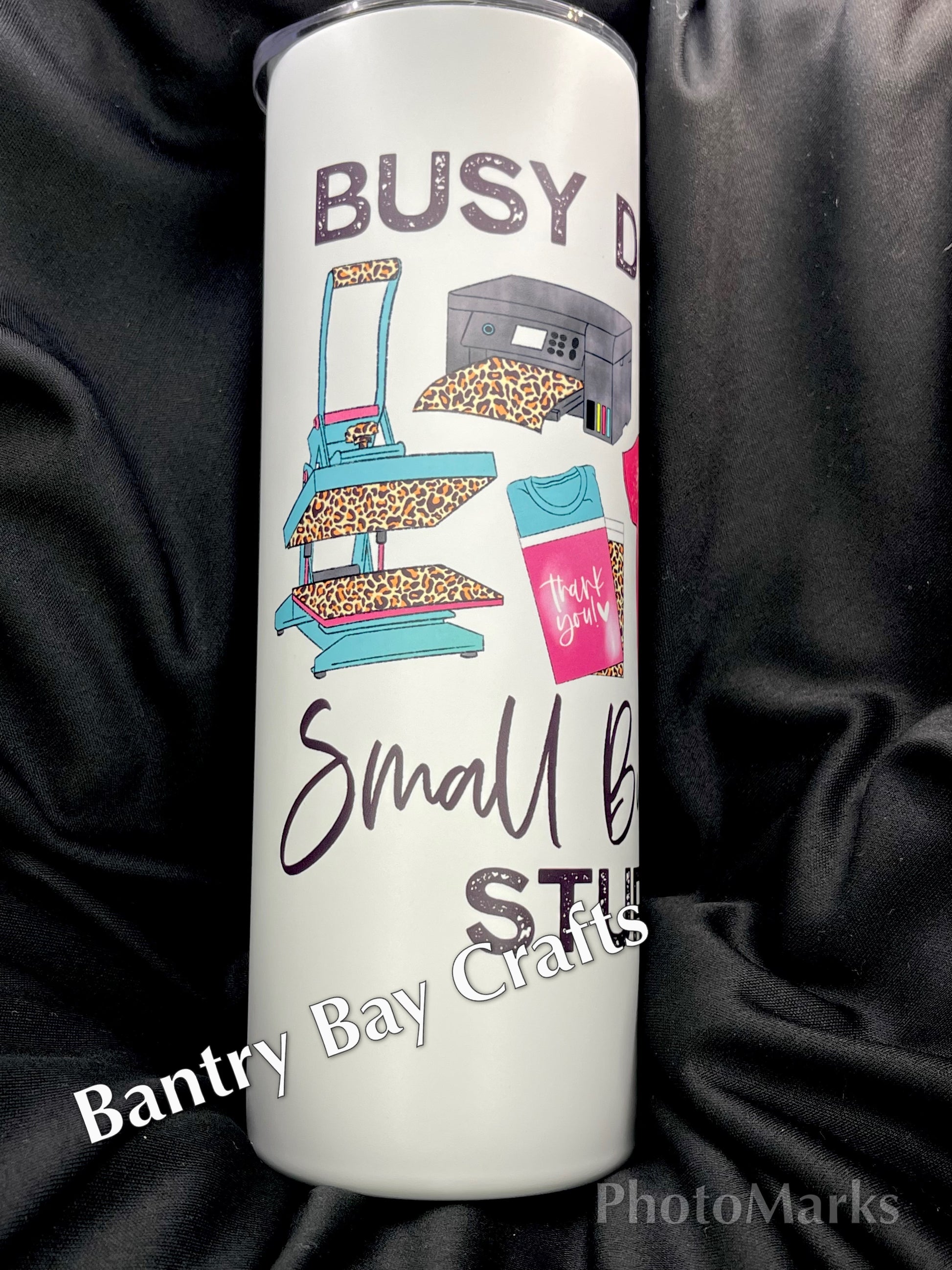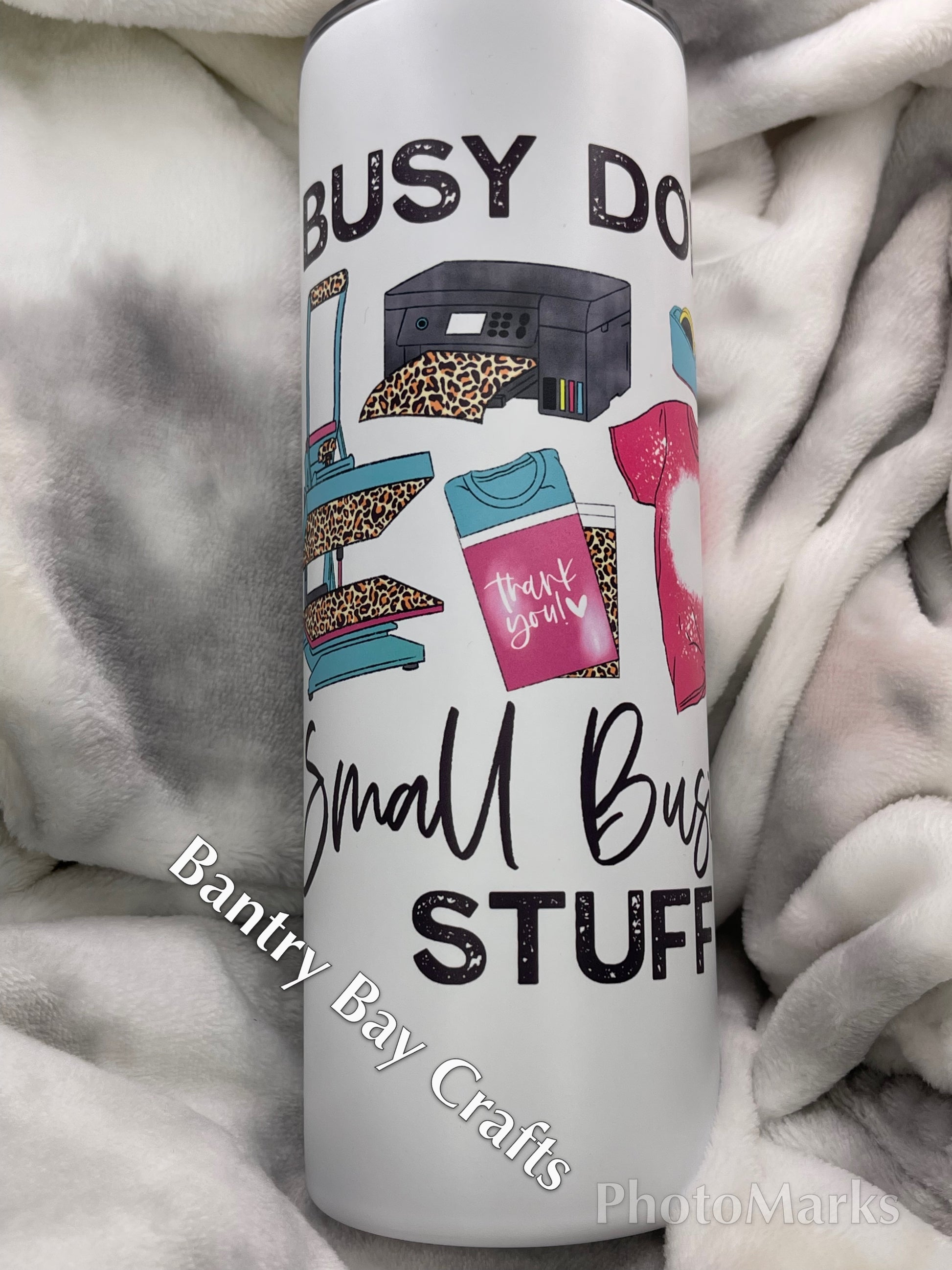 Here we have a double insulated stainless steel that says We have a busy doing small business stuff that glows in the dark . This particular theme is based off crafting . We can do this tumbler in glossy as well .