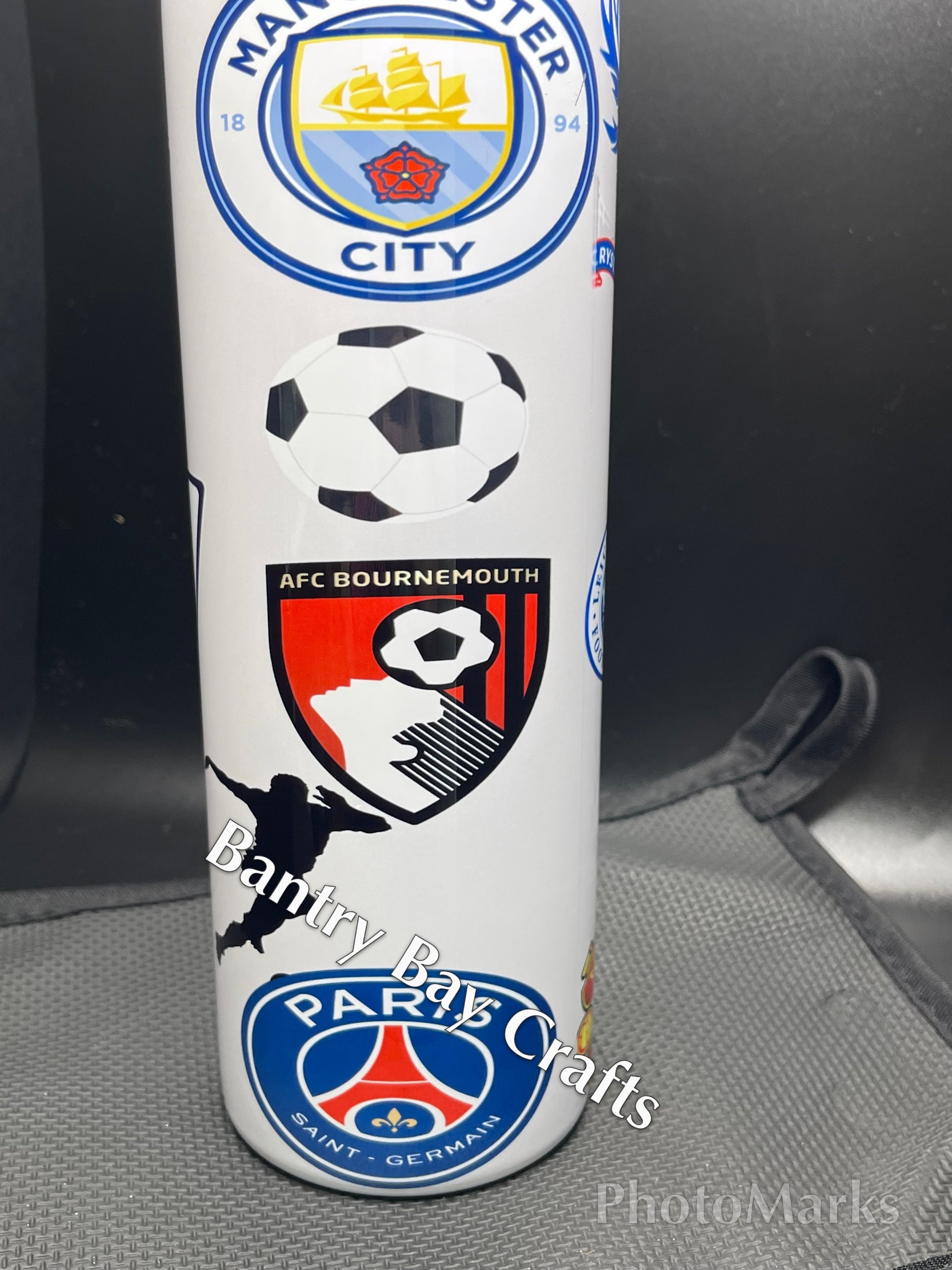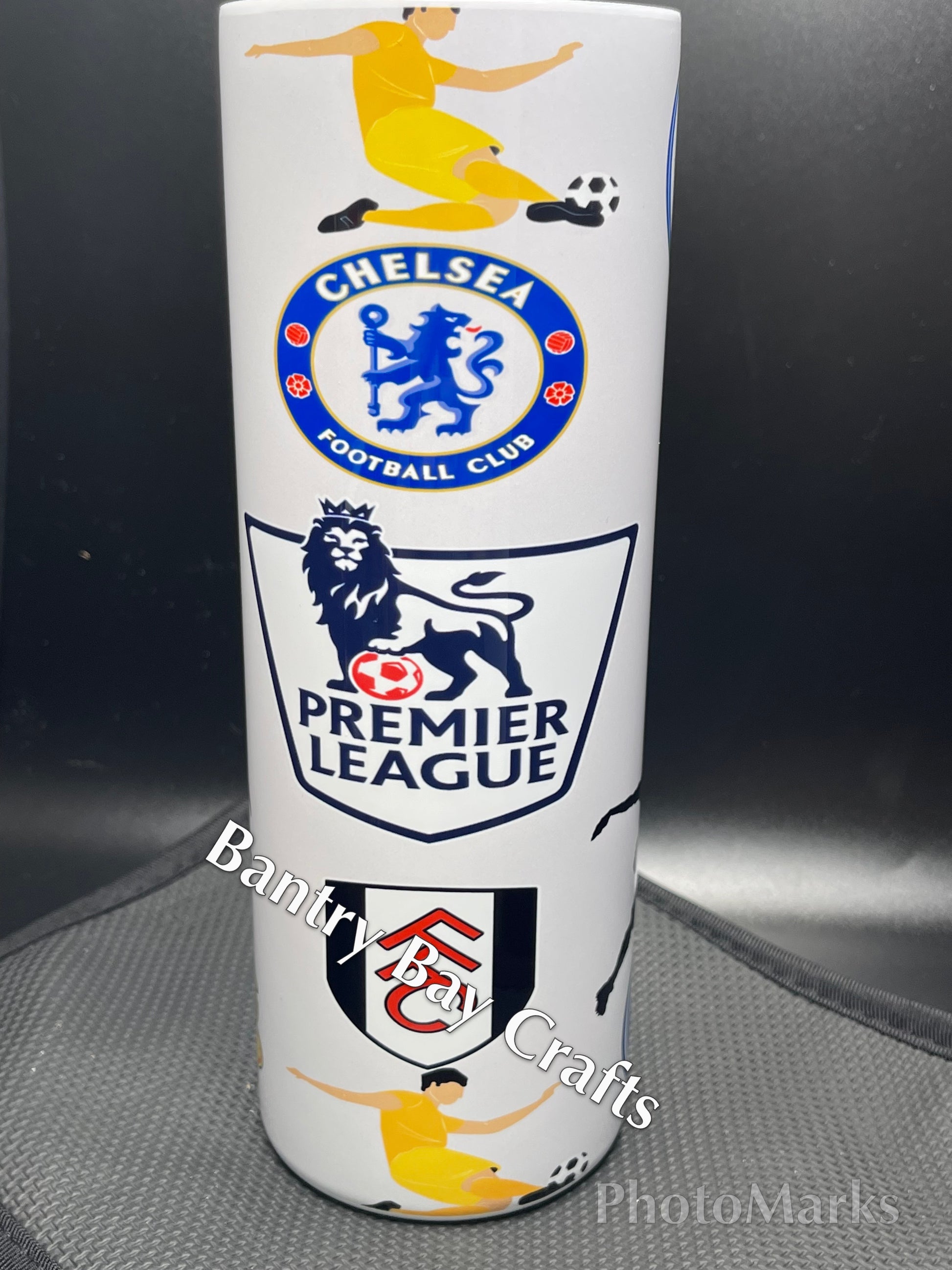 A custom designed premier soccer league tumbler with most of the teams on the cup. The customers son picked all of the teams that are placed on this tumbler.