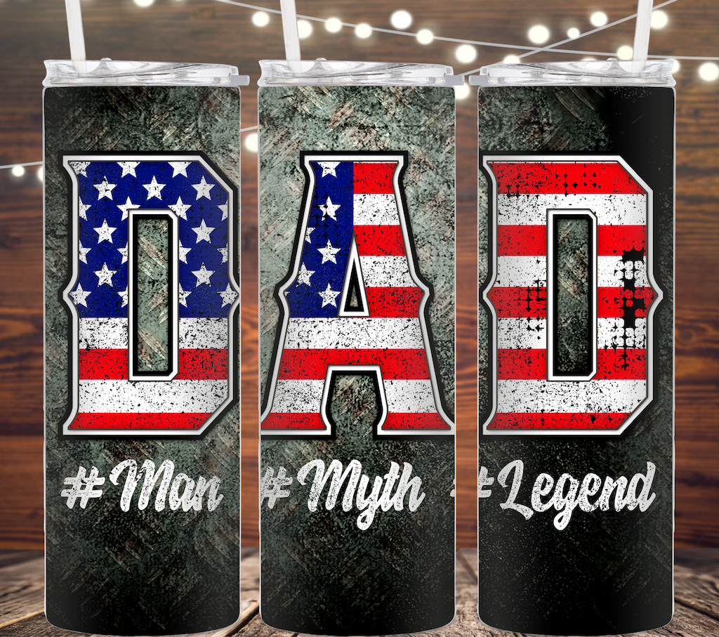 Dad #man #myth #legend tumbler with an American Flag in the word DAD.