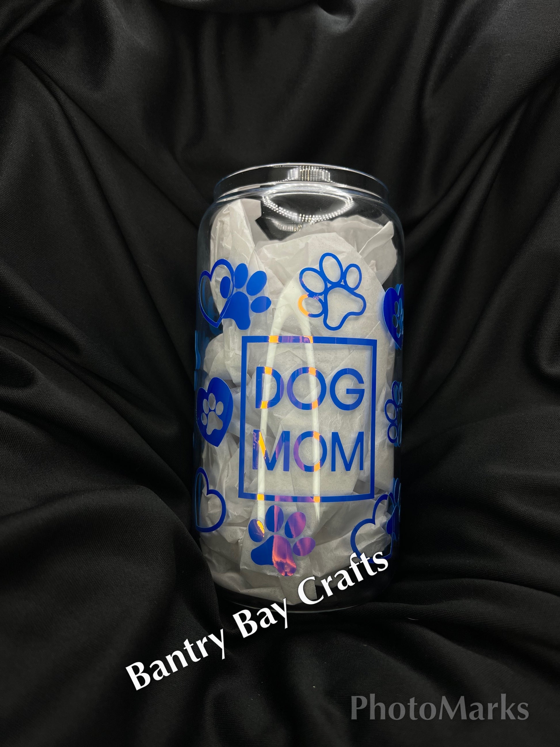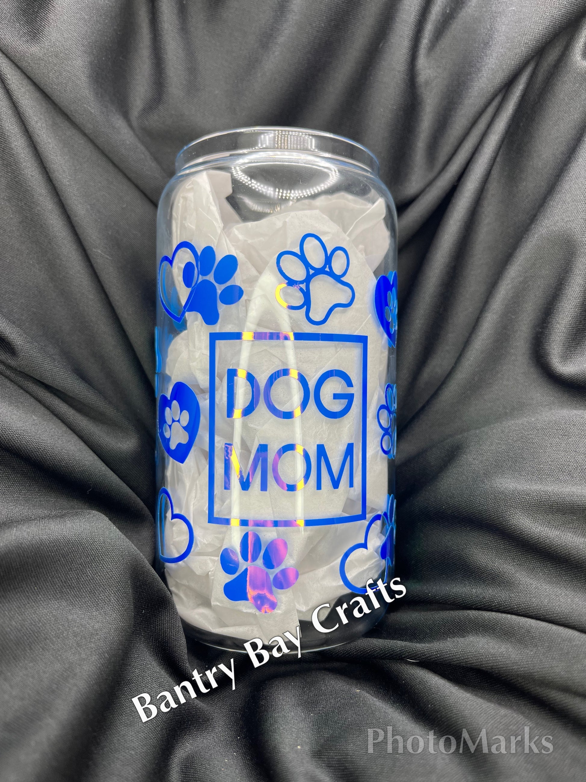 A holographic 16 oz libby glass. Made with a blue holographic permanent vinyl. When the lights hits this libby it gives off a beautiful reflective look.