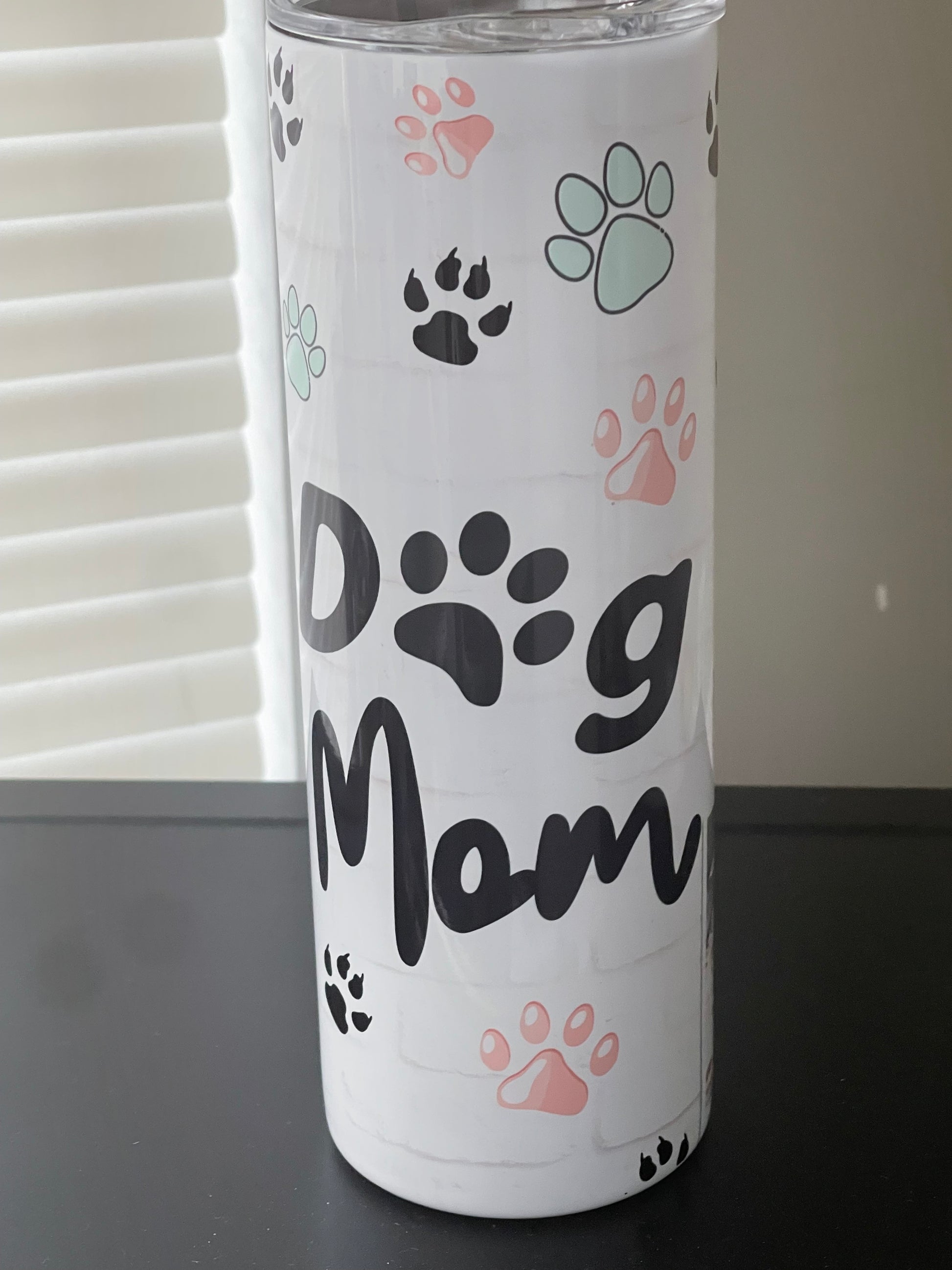 Here we have a double insulated stainless steel personalized ( pictures not shown) dog mom tumbler in glossy. This particular up has 2 phots but we can add more . We also could do it in a glow in the dark tumbler.