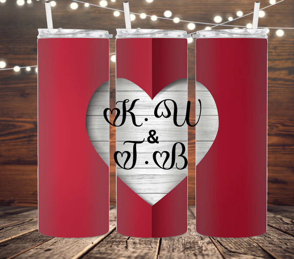 We have this cute red tumbler with a white wooden spot that we can add your initials.