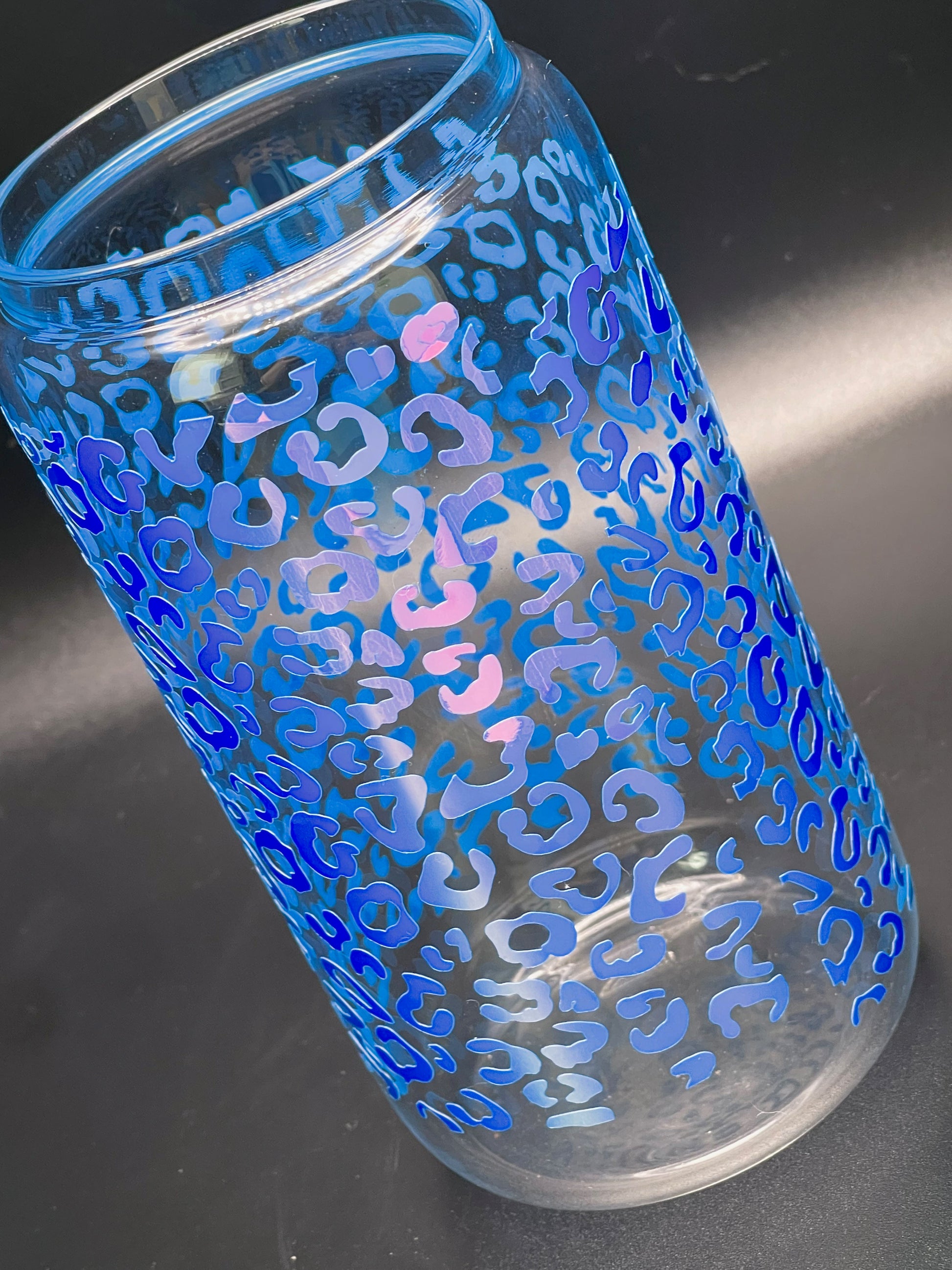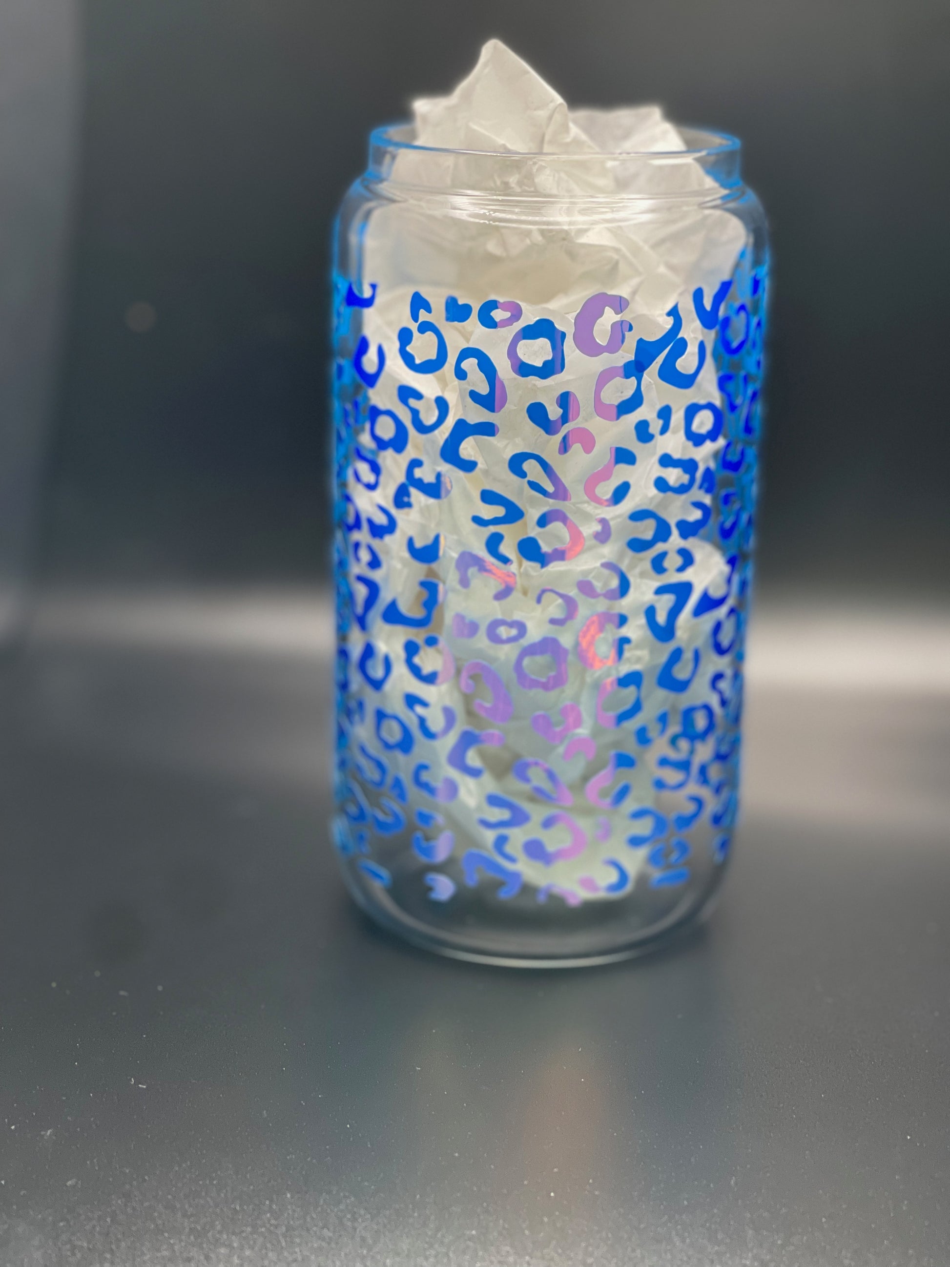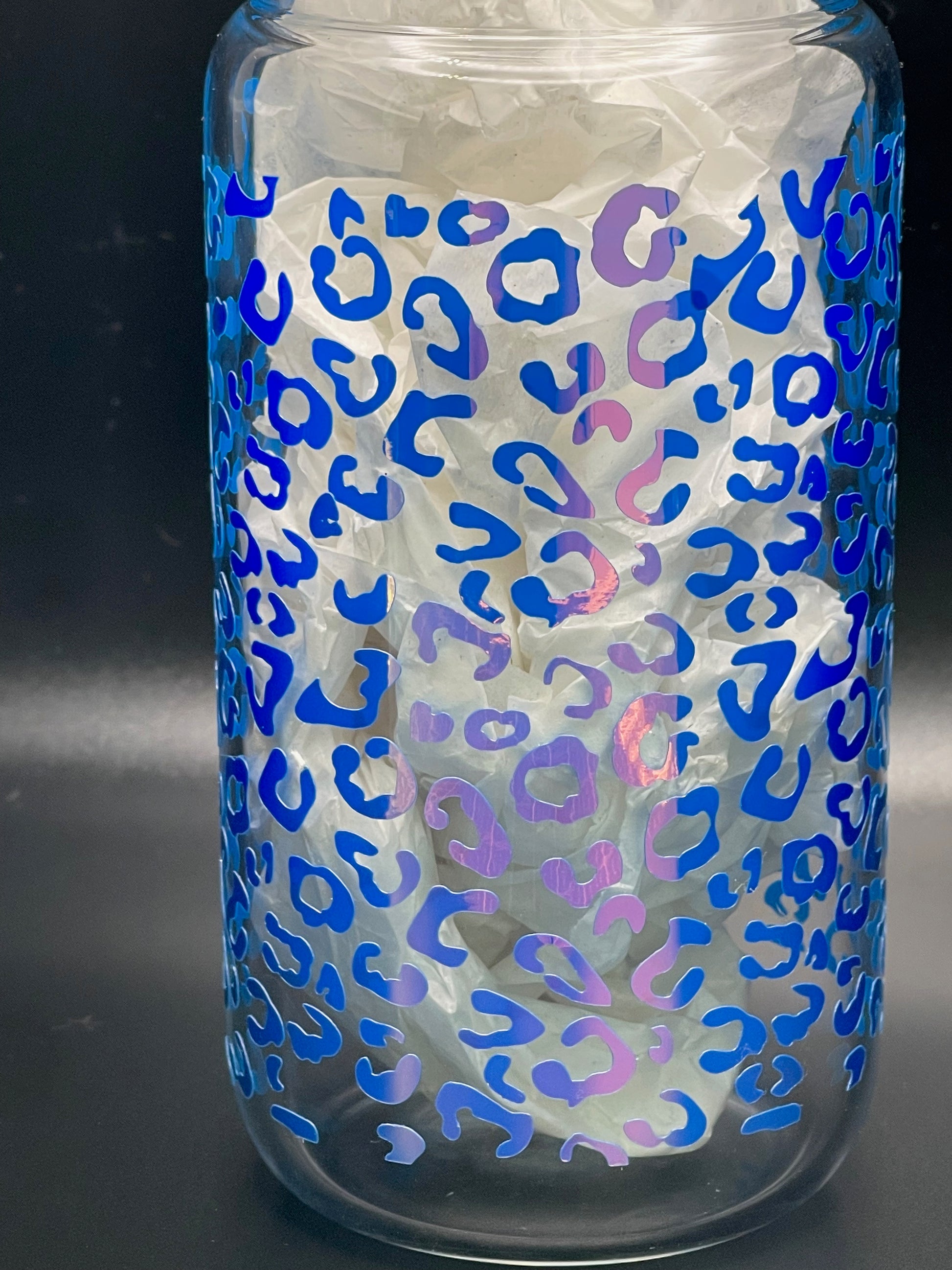 Our 16 oz glass libby cup done is a holographic permanent vinyl that has a beautiful coloring with the different angles and lighting.