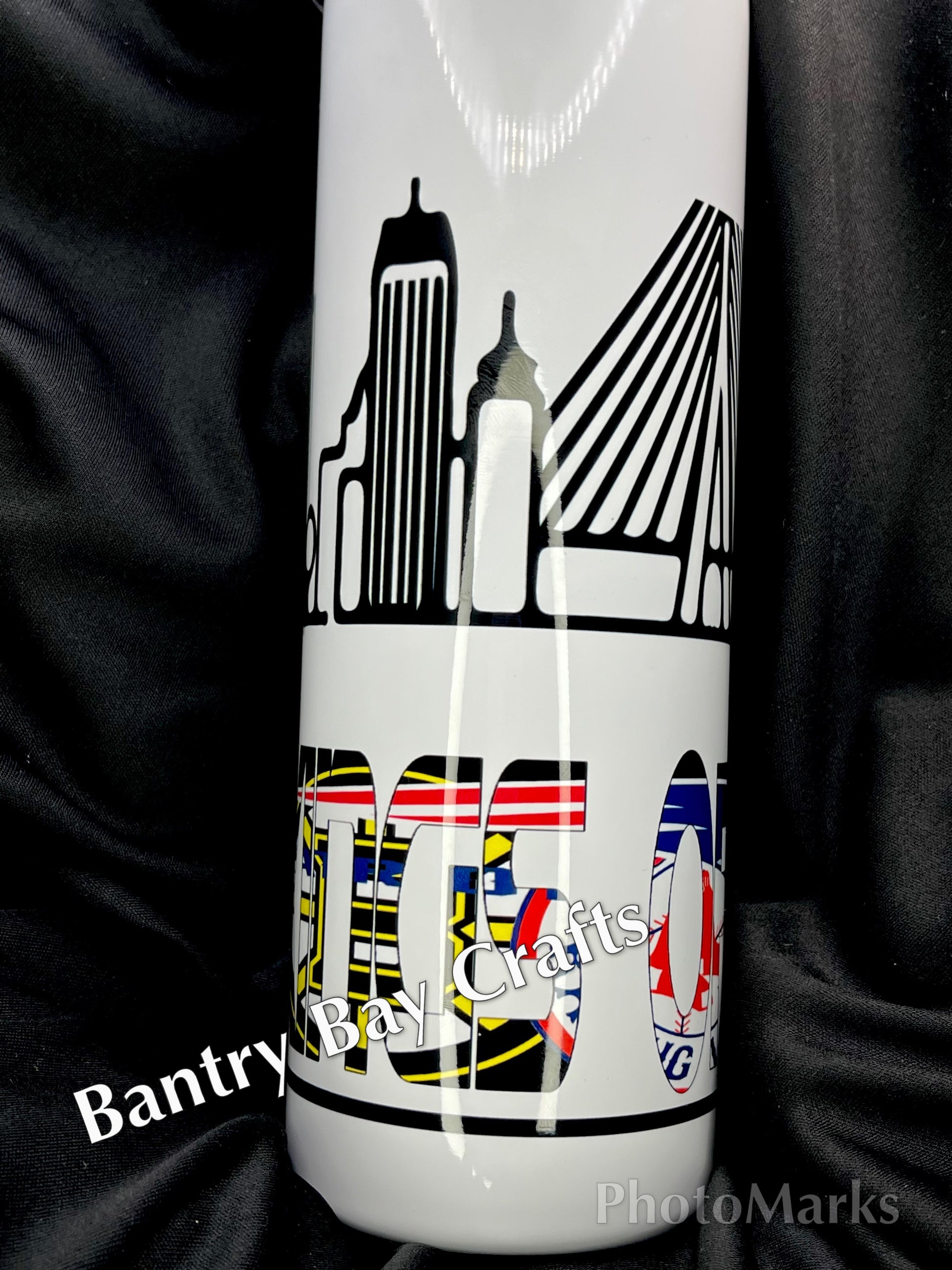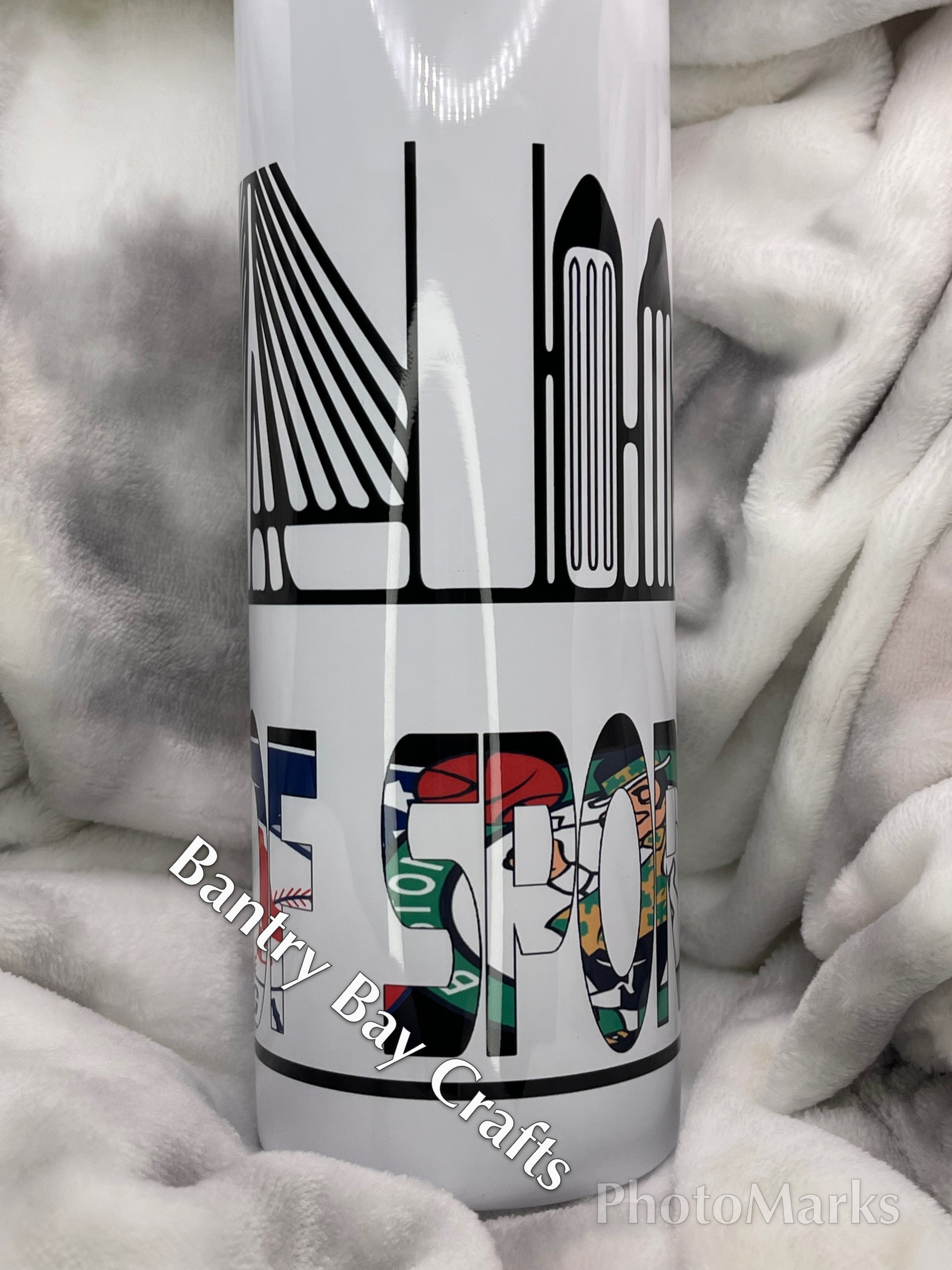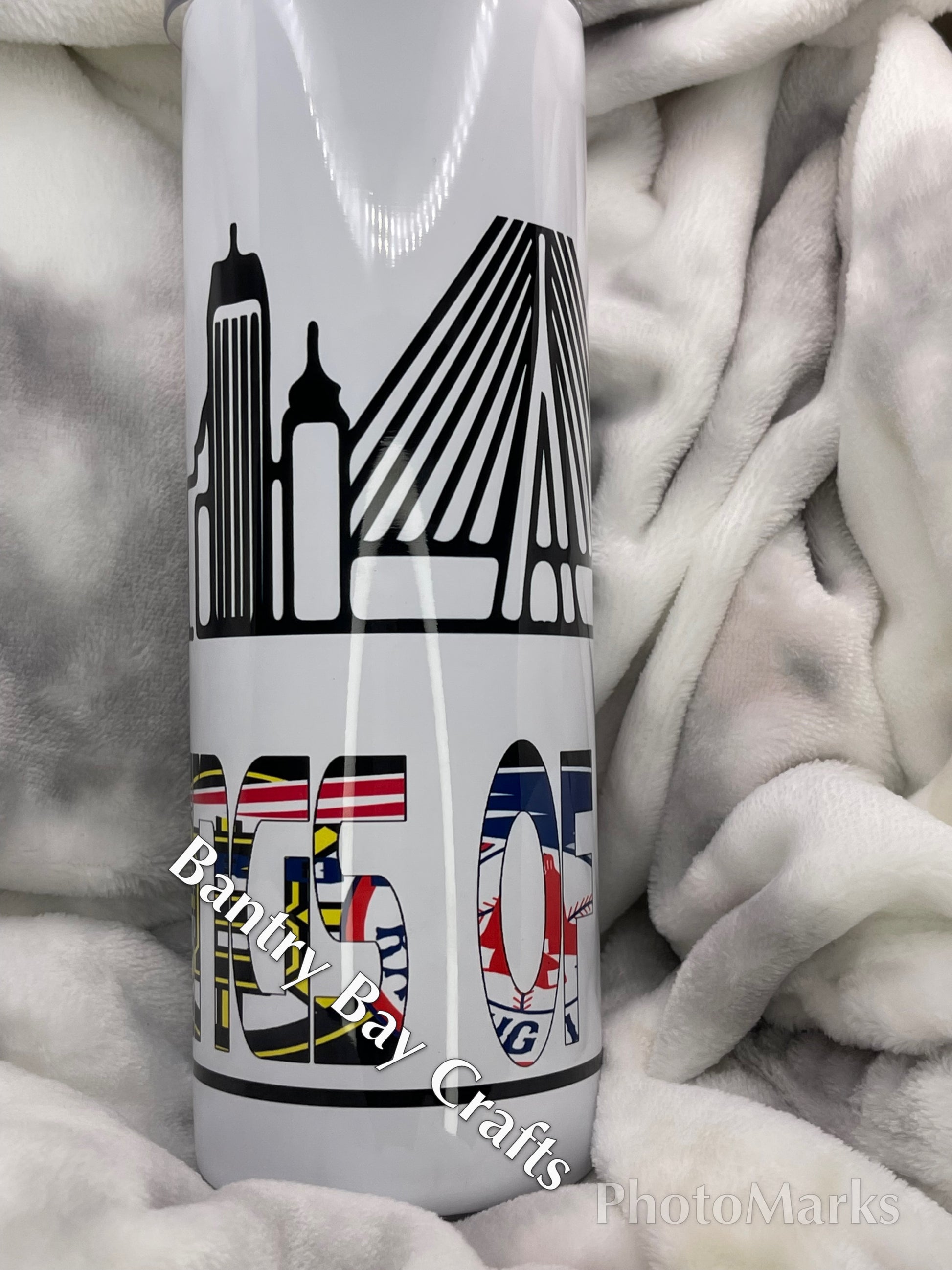 We have this pretty neat KING OF SPORTS double insulated stainless steel tumbler done with the Boston sports team with the Zakim Bridge in the background.