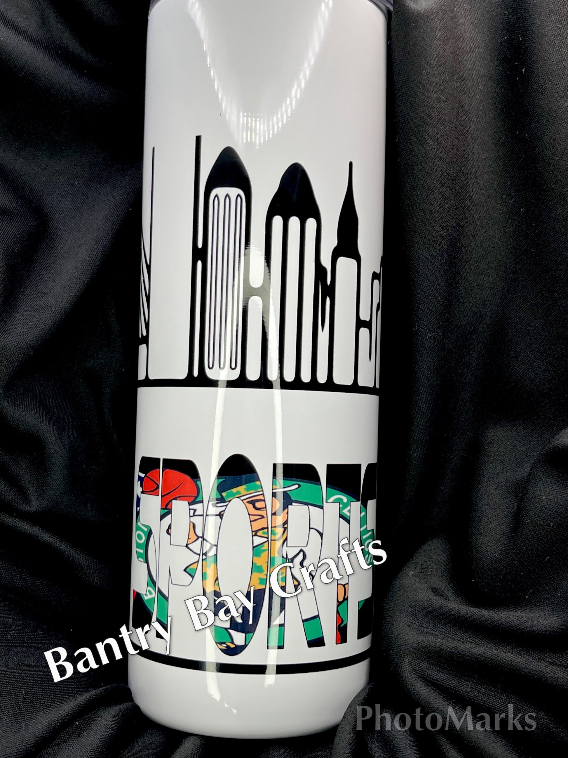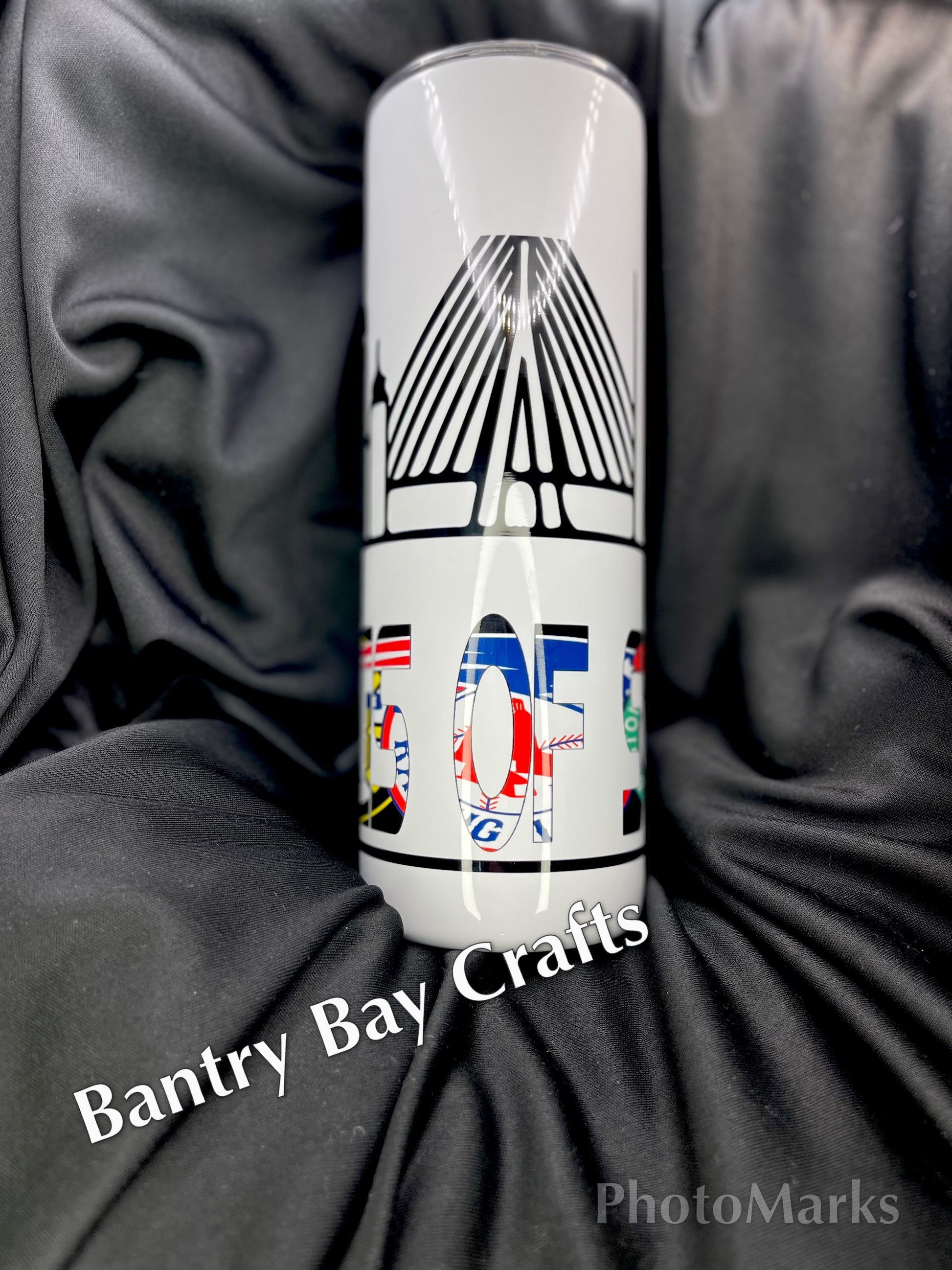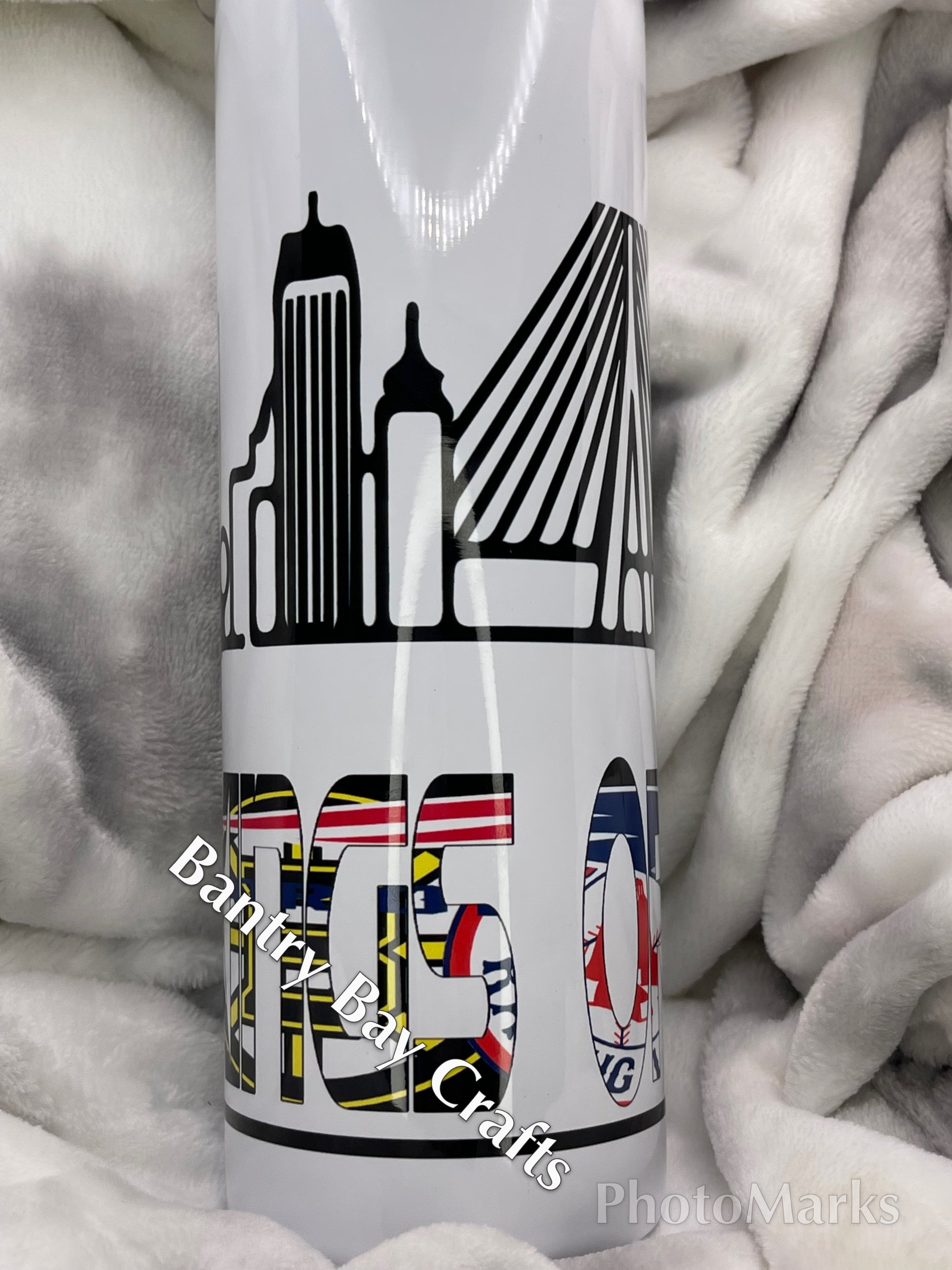 We have this pretty neat KING OF SPORTS double insulated stainless steel tumbler done with the Boston sports team with the Zakim Bridge in the background.