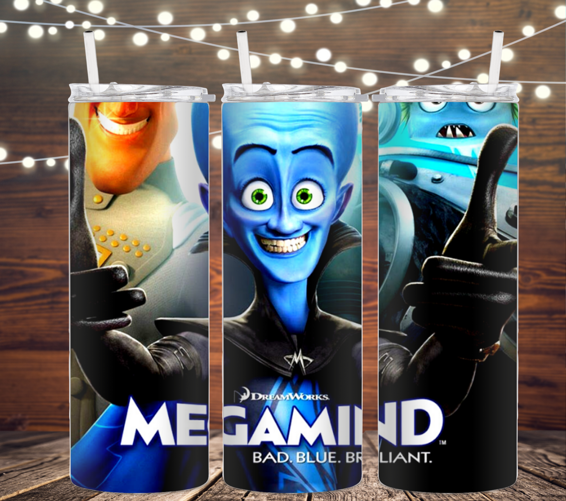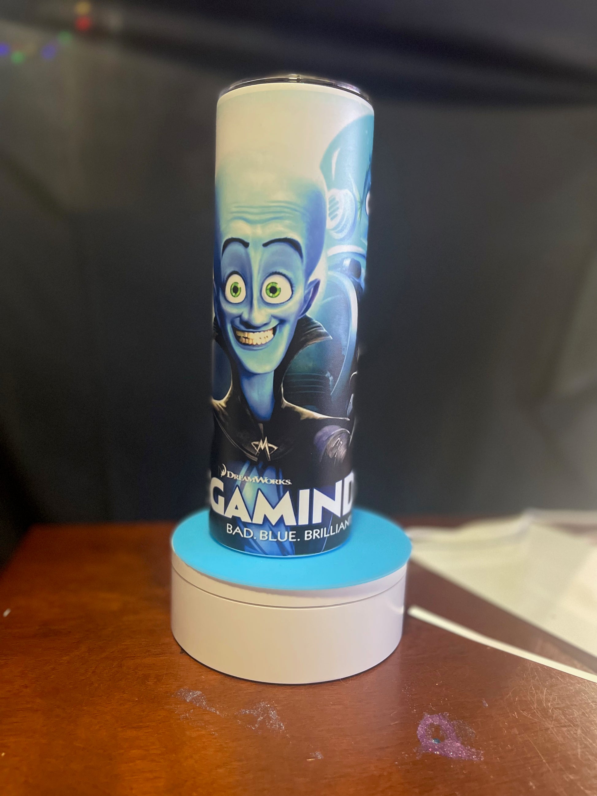 This is a glow in the dark megamind tumbler which was given to an Essential Employee during the pandemic . We did this as a thank you for all her hard work ! We can make this as well in a glossy format.