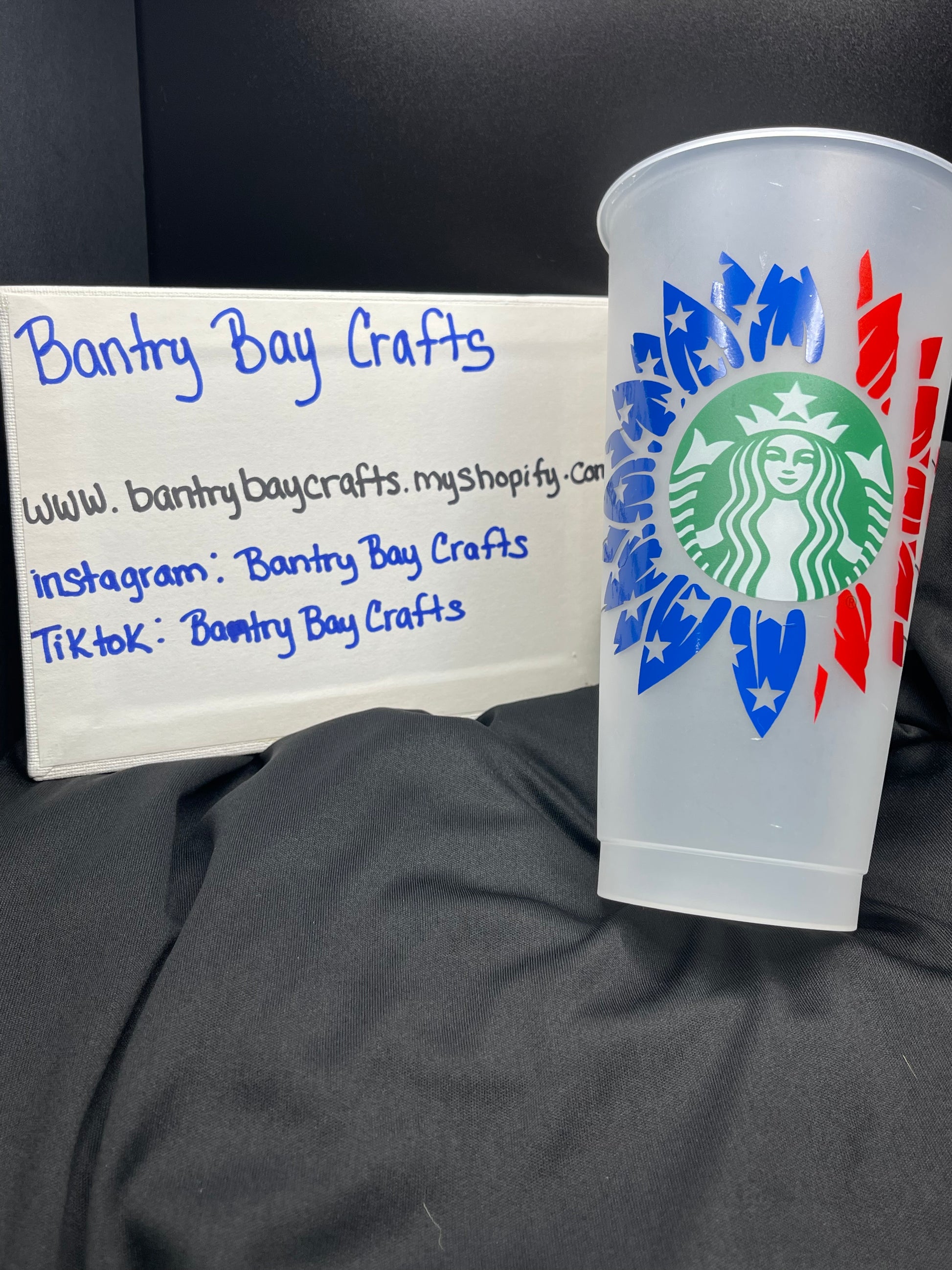 We have a simple yet very pretty sunflower that has been transformed into an American Flag. With this cup can we can add a name to it for you.